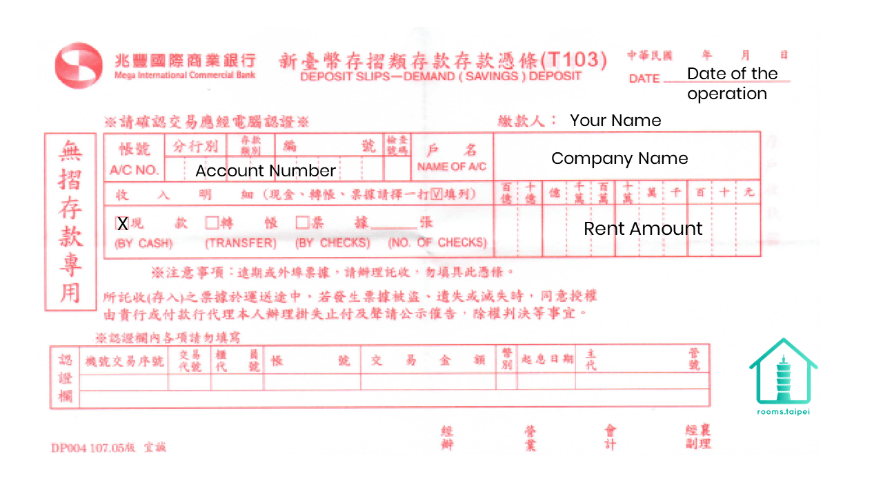 This is the example for Mega Bank. Changhwa bank slips are similar. Ask the counter clerk for help.